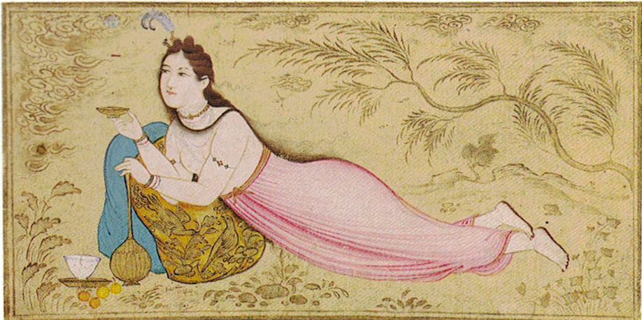 A young woman, scantily but elegantely clad in sheer dress, is reclining on the ground leaning on two bolsters, one of which is finely decorated with birds and foliage. She gazes to the left holding a small bowl in her right hand, and the neck of a long necked bottle in her left. A small dish, and some fruit are spread before her. The nearly monochromatic setting, drawn in light brown on a plain ground, consists of scroll clouds and foliage. The painting is reportedly mounted on a leaf from a manuscript page of Persian poetry.