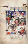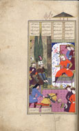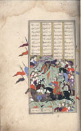A complete manuscript of high quality containing 243 folios measuring 37.9 x 23.5 cm. that constitute the first half of the Shahnama. Another volume that constitutes the second half of the epic is in the Chester Beatty Library, Dublin (Ms. D). The text is written in good nastaʿliq in four columns, twenty-five lines per page. The volume includes two double page illuminations, a number of smaller illuminations, and thirty paintings, one of which is a double page frontispiece (ff.1v and 2r). Twenty eight of the thirty paintings are signed by Moʿin Moṣavver, which are for the most part clever solutions to unique compositional problems. The two unsigned paintings are clearly not by Moʿin; one (f.141) is apparently by a follower of Moʿin, while another (f.232) is a later addition perhaps added when the volume was rebound in red leather in India during the Nineteenth Century.