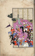 The colophon indicates the text was completed in Jomādi II 1064/April - May 1654. Several of the paintings (folios 45v, 151 and 188) are dated 1065/1654-55. The inscription accompanying the illustration on folio 205v states that the first volume of the Shahnama, meaning the paintings therefor, were completed on 16 Šavvāl 1065/19 August 1655. The double page frontispiece (ff.1v and 2) was apparently completed afterward for it is dated Shaʿbān 1067/May - June 1657. The paintings in the second volume (Ms.D) were painted almost contemporaneously, for one of them is dated Moḥarram 1066/November 1655.