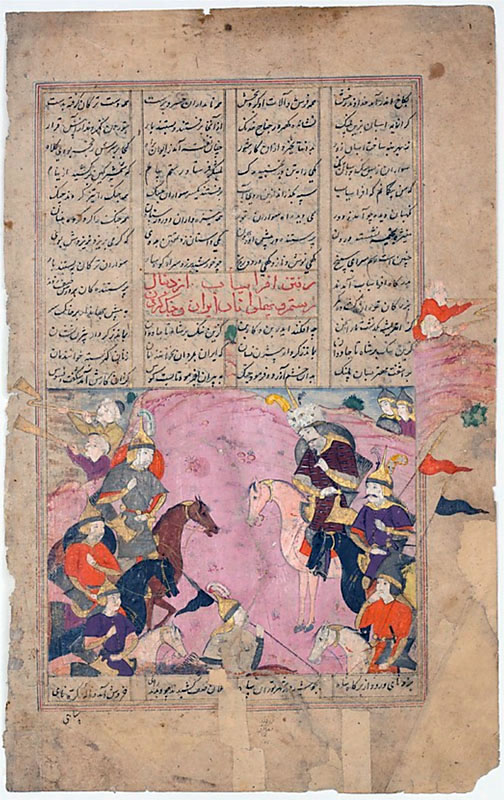 The painting portrays the preliminaries of the first encounter of Rostam and Afrāsiyāb prior to the commencement of hostilities when Rostam attempted to grab Afrāsiyāb by the belt and carry him back to Iranian lines. Rostam, in his familiar tiger skin coat and leopard skin headdress, sits on a light tan horse on the right side of the composition, accompanied by two warriors wearing steel helmets in the lower right foreground. Two other warriors, similarly attired, peer down from over the ridge line in the extreme upper right. Afrāsiyāb is mounted on a brown horse on the left side of the painting, accompanied by three mounted warriors in the lower left foreground. The setting is a non-descript pink hillside that rises to a peak at the top center of the composition. Two turbanned trumpeters herald the event with long horns in the left background, while two others extend into the right margin from behind the text.
